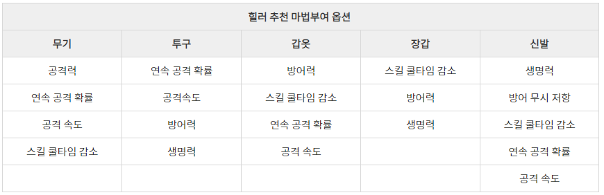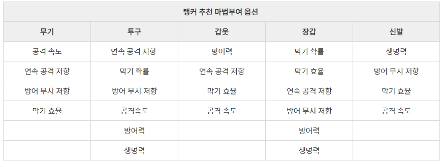 장비마다 부여되는 옵션 수치들이 다른 건 알고 계셨죠? 모르셨던 분은 위의 표를 보고 참고하시면 좋을 거 같네요 색이 칠해진 부분이 부위별로 최대 옵션 수치를 만들 수 있는 항목들입니다.