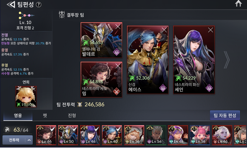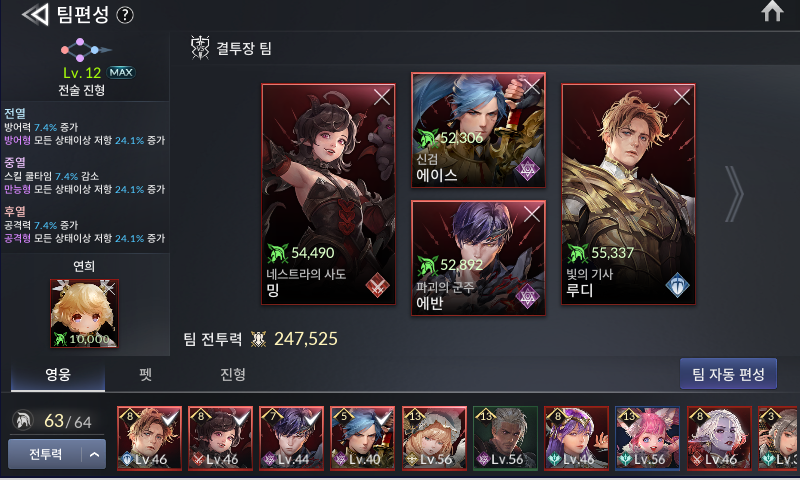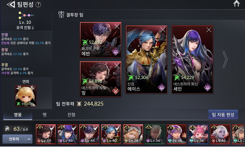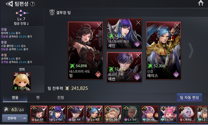 그리고 두번째로 유행하고 추천하는 덱은 협공진형2의 전열 에이스, 세인, 에반, 밍덱의 에세에밍 덱입니다. 역시나 공속이 중요하므로 빛 공속템과 공속펫은 필수 입니다.