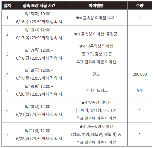 기간별 받을 수 있는 보상은 위의 표를 참고하세요~ 배경은 아니지만 그래도 4성 이마젠을 받을 수 있다니 참 마음에 드네요 ㅎㅎㅎ 갓게임!! 호우~ ㅋㅋ