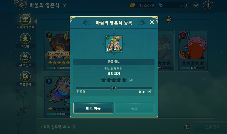 몬스터를 눌러서 살펴보면 드랍 아이템에서 영혼석을 주는 몬스터들이 보일겁니다. 그럼 등록하고 싶은 몬스터를 선택해서 사냥만 해주시면 끝입니다. 이동을 누르면 자동으로 해당 몬스터 지역으로 이동 가능합니다.