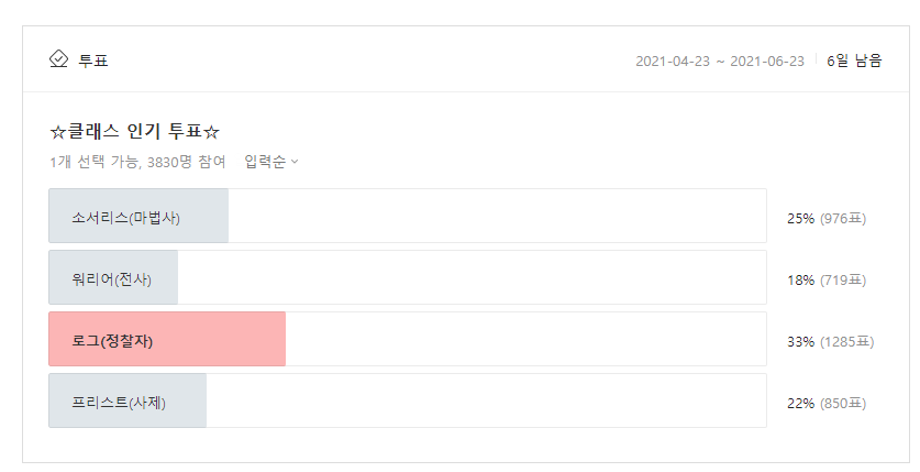 개인적으로 인기 클래스 투표가 궁금했는데 엇!! 로그가 1위네요 그다음 마법사, 사제, 전사 순으로 원딜 위주의 캐릭이 인기가 많은거 같습니다. 전 전사를 생각 중인데 동네북이 될려나 ㅠㅠ