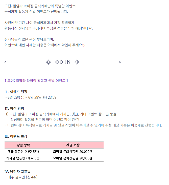 그외에도 활동왕 선발 이벤트도 하고 있으니까 관심 있으신 분은 참여해 보시기 바랍니다. 그럼 오딘 나올때까지 존버~!! 모두 즐거운 하루 되세요~