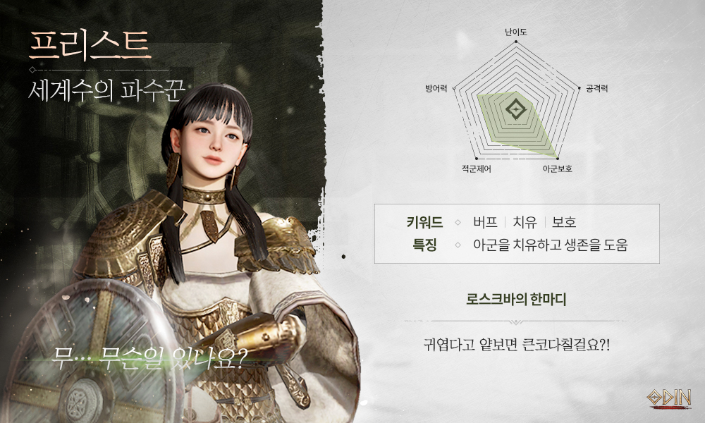 이상입니다. 그럼 좋은 클래스 잘 선택하셔서 재밌게 플레이 하시기 바랍니다. 오딘이여 빨리나와라~~