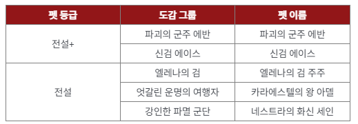 다음은 전설 등급 신규 펫을 살펴보도록 하겠습니다. 먼저 주주 펫은 4초 피해면역, 패시브는 공격 속도 21%증가, 광역 피해 32%증가, 아델 펫은 20초 동안 막기 확률 30%증가, 패시브로는 공격력과 방어력이 11% 증가한다고 합니다. 마지막으로 세인 펫은 10초 동안 공격속도 35%증가, 패시브로는 치명타 확률 21%, 단일 피해 32% 증가라고 합니다.