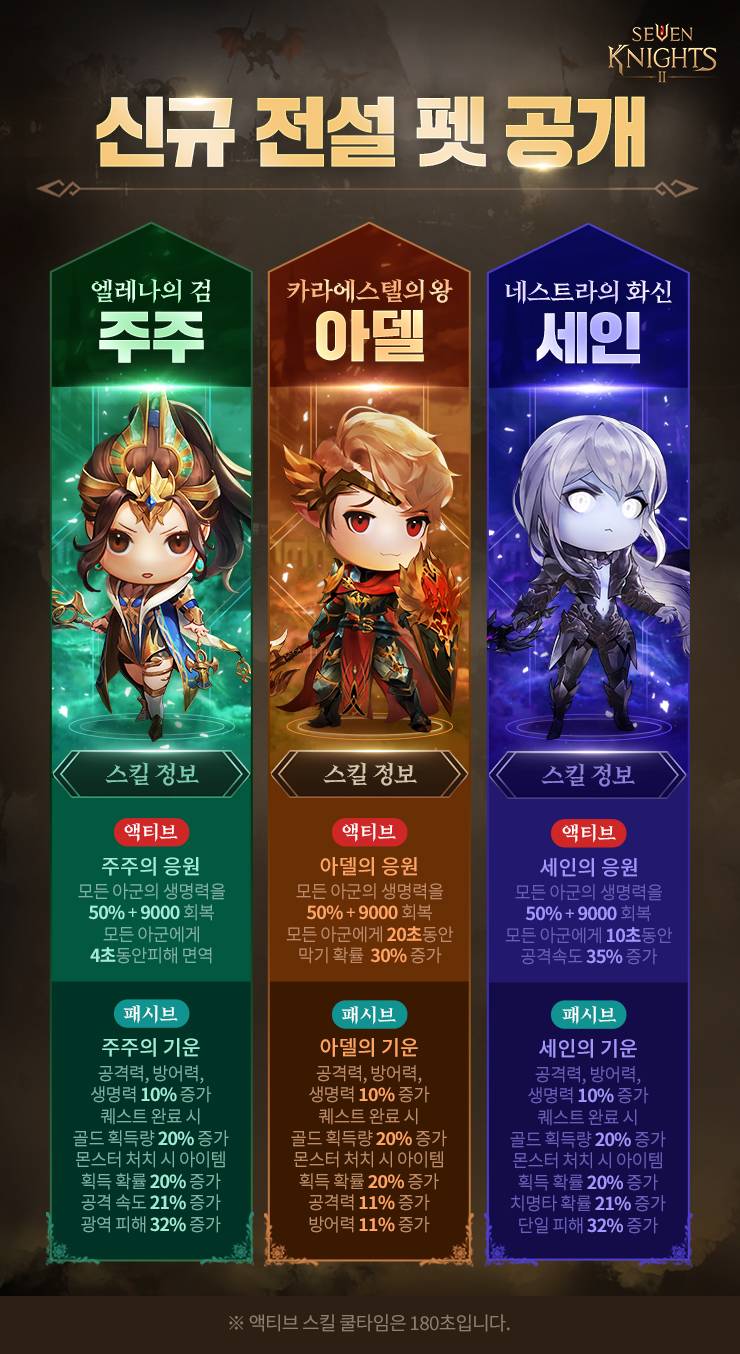 이번 세븐나이츠2 업데이트에 신규 전설+와 전설 등급 펫이 추가가 된다고 하네요, 과연 어떤 펫들이 추가되고 어떤 능력치와 스킬들이 부여되었는지 한번 살펴보도록 하겠습니다.