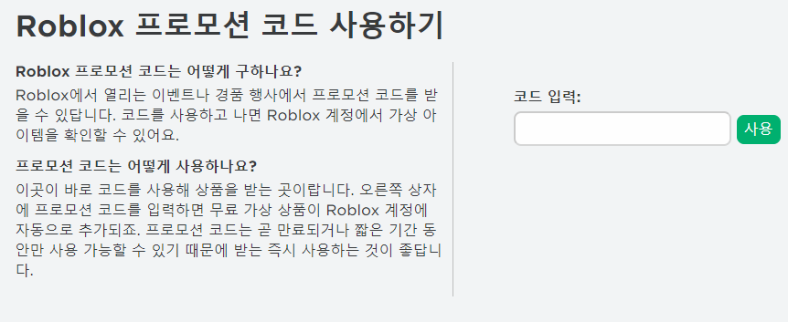위와 같이 로블로스 프로모션 코드 사용하기 페이지가 나온다면 정상적으로 들어가신겁니다. 오른쪽에 코드 입력이라고 보이시죠?