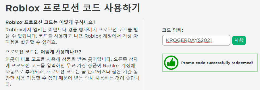 이곳에 코드번호 : KROGERDAYS2021를 입력하신뒤 사용을 눌러 보세요 초록색으로 엄지척 표시가 나온다면 정상적으로 코드를 사용한겁니다