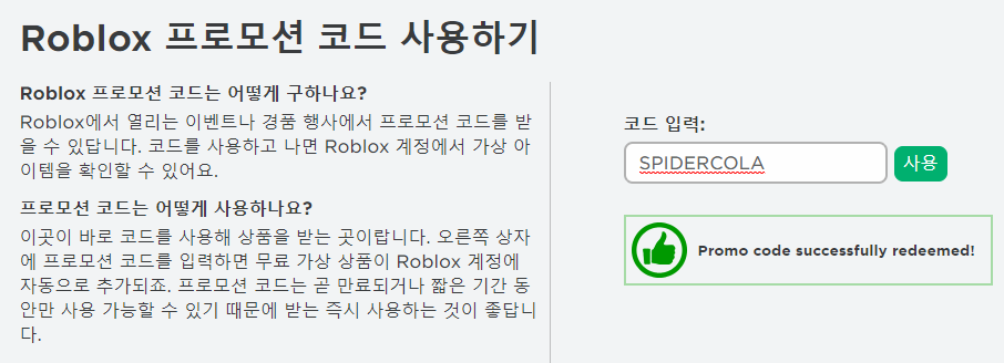 마찬가지로 코드 입력창에 SPIDERCOLA라고 입력해 주세요~