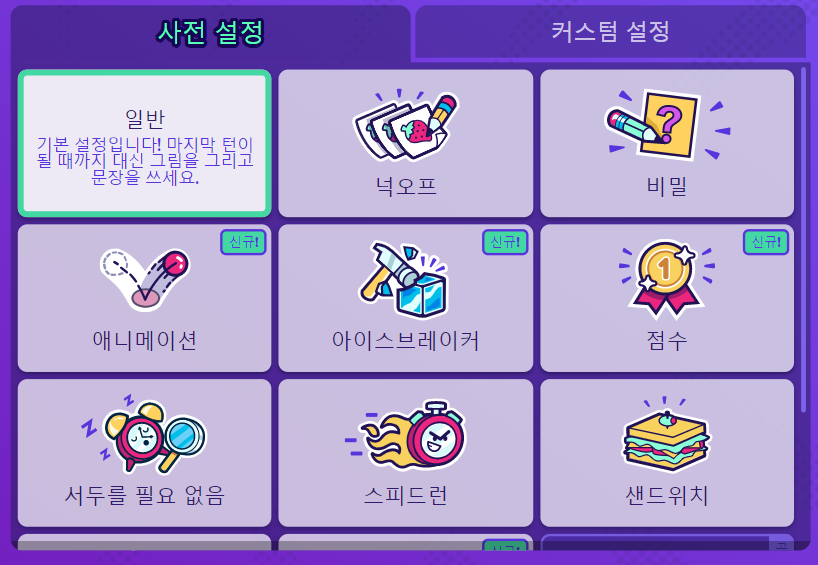 플레이어 설정이 끝나신 분은 사전 설정을 해주셔야되요 게임 옵션이죠, 옵션은 일반, 넉오프, 비밀, 애니메이션, 아이스브레이커, 점수, 서두를필요없음, 스피드런,샌드위치, 크라우드, 영화를 설정해 주셔서 플레이 하시면 됩니다. 마우스를 올려보면 자세한 설명을 확인 할 수 있습니다.
