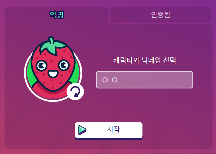 먼저 자신이 사용할 캐릭터의 닉네임을 설정해 주셔야 됩니다. 설정이 끝나면 시작을 눌러주세요