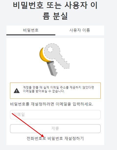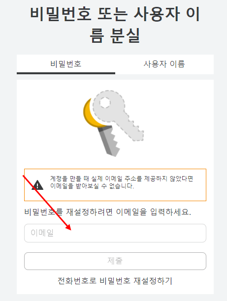 그리고 자신이 등록했던 이메일을 입력후 제출을 눌러 주세요~(이메일 등록을 하지 않았다면 계정을 새로 만드셔야되요...ㅠㅠ)