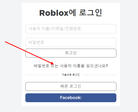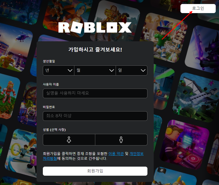 비밀번호 찾기는 로블록스 홈페이지에서 로그인 버튼을 클릭합니다.