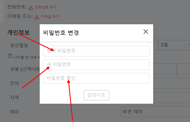 그리고 현재 비밀번호와 새 비밀번호, 마지막으로 비밀번호 확인까지 누르신 뒤 업데이트 하시면 바로 비밀번호를 변경할 수 있습니다.