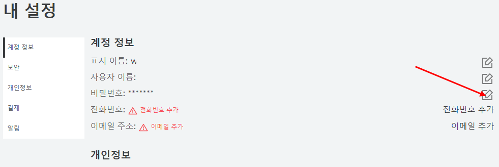 내 설정창이 나오면 비밀번호 우측에 보이는 연필과 종이 모양 아이콘을 클릭합니다.