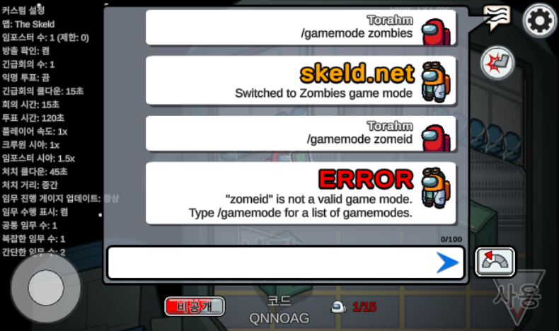 적용되지 않았다면 PC마찬가지로 빨간색 에러 메세지가 출력되요. 간단하죠? 그럼 여러가지 모드를 이용해서 재미있게 어몽어스를 플레이 해보시기 바랍니다. 이상 어몽어스 모드 모바일과 PC 적용법을 마치도록 하겠습니다. 즐겜하세요~