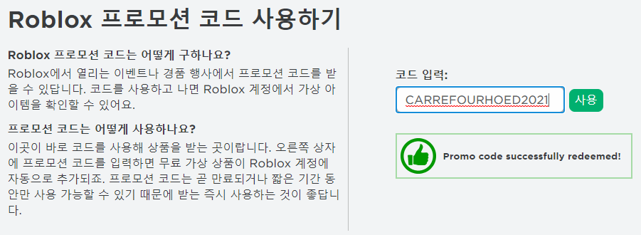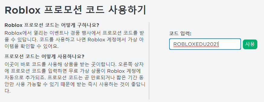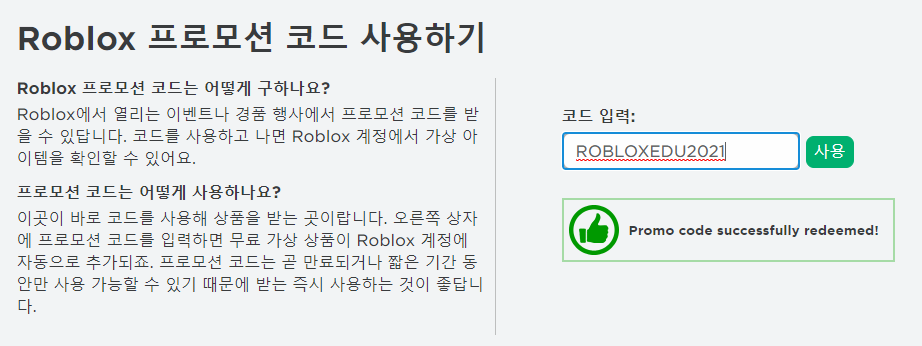 첫번째 프모로코드(프로모션코드)는 ROBLOXEDU2021입니다 오타없이 잘 입력해 주세요 아니면 제가 써놓은 걸 복사 후 붙여넣기 해주시면 됩니다