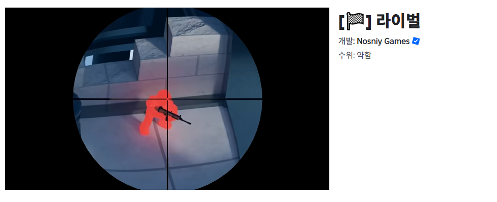 라이벌은 로블록스에서 만날 수 있는 가장 퀄리티 높은 총싸움 게임이에요. PC 게임 못지않은 그래픽과 부드러운 조작감 때문에 많은 사람들이 좋아해요.